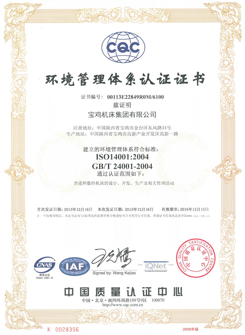 環(huán)境管理體系認證證書